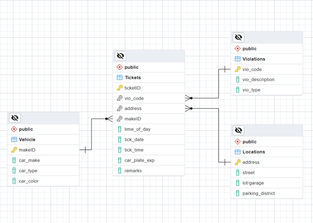 Main Tables: Tickets, Violations, Locations, and Vehicle